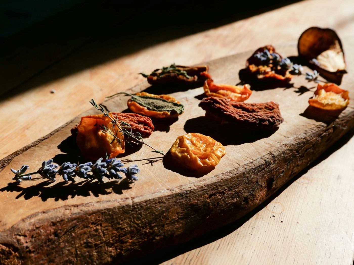 Taking advantage of the abundance of fruits that cover our tables and market stalls in the summertime, we spent Sunday morning preparing a mix of seasonal dried fruits, accompanied by the flavors of common herbs that are readily available.