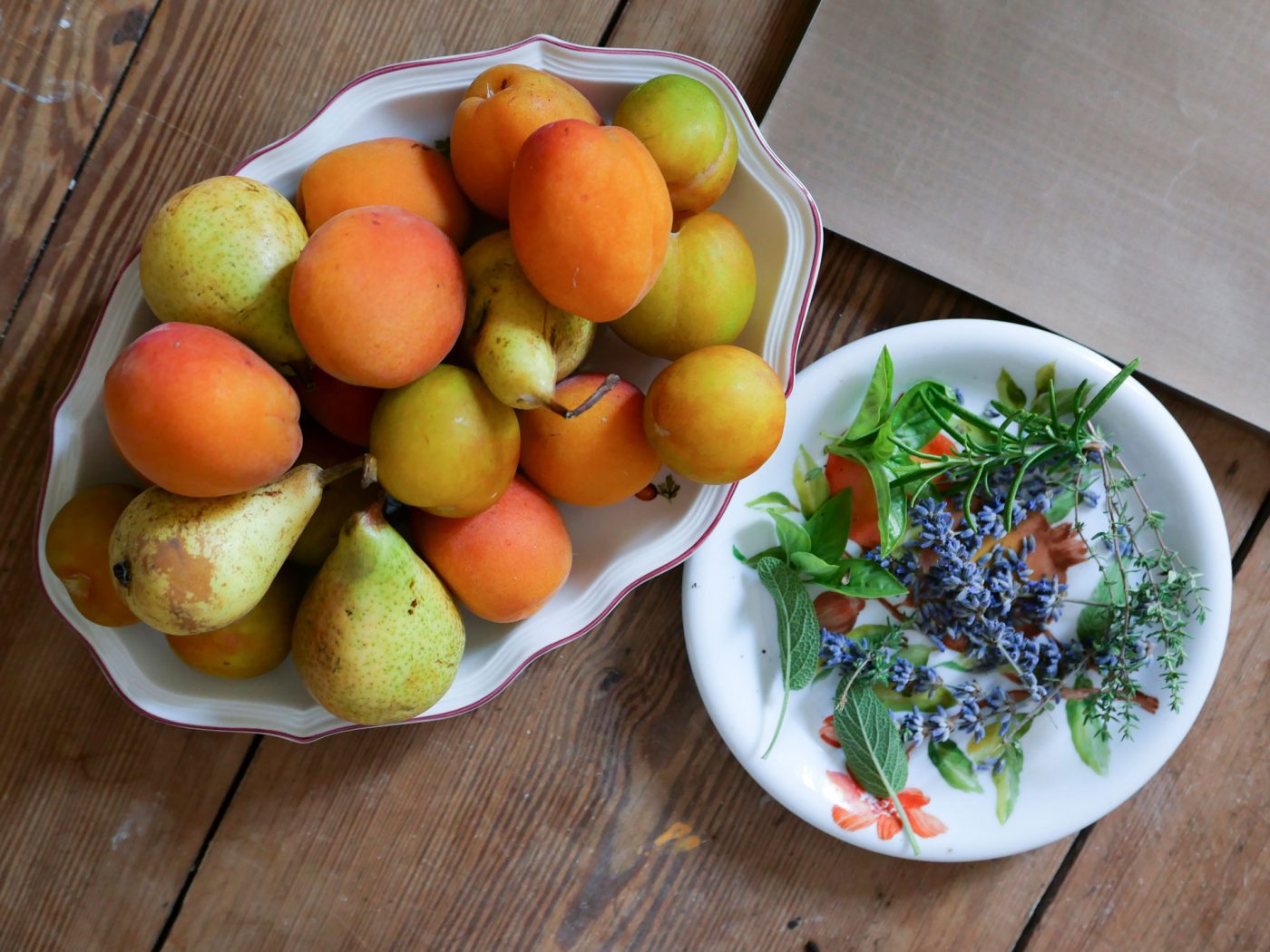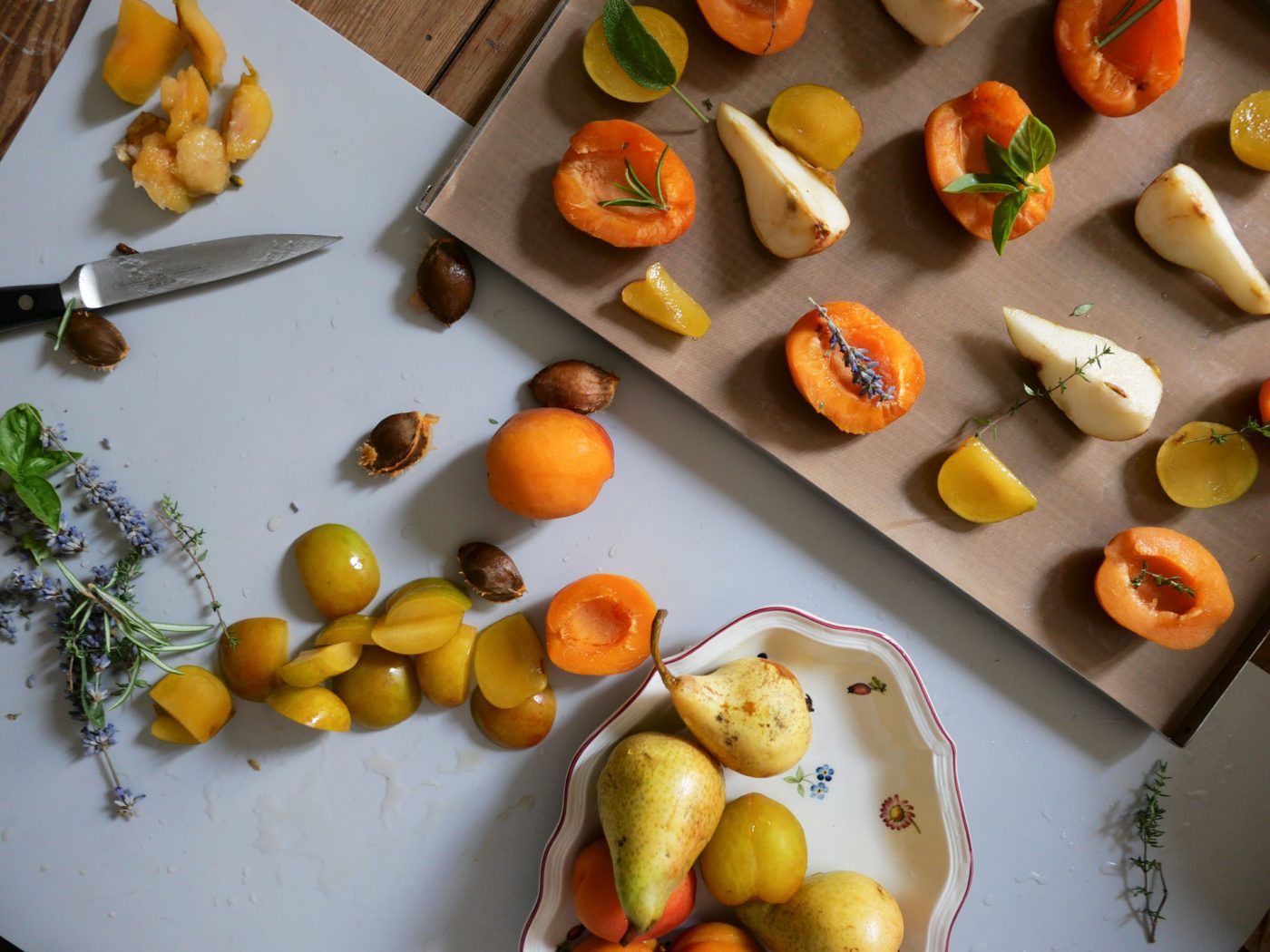 Cut the apricots and plums in half and remove the stone, then cut the thigh pears into 1-inch-thick slices. Prepare the herbs by cutting them evenly into sprigs no longer than 4.5 cm. Arrange the fruit spaced on the trays on the Teflon sheets placed in the drying tray. Set the dryer to 48 hours at 60° and every 12 hours turn the fruit in the pan. Let cool and store the dried fruit with the herbs in a glass jar.